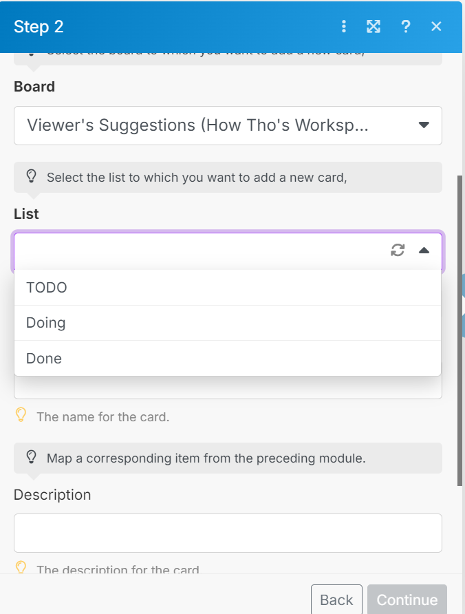This will add a new “List” option, displaying all the lists on your board. Select the one you prefer. I’ll be choosing “TODO.”