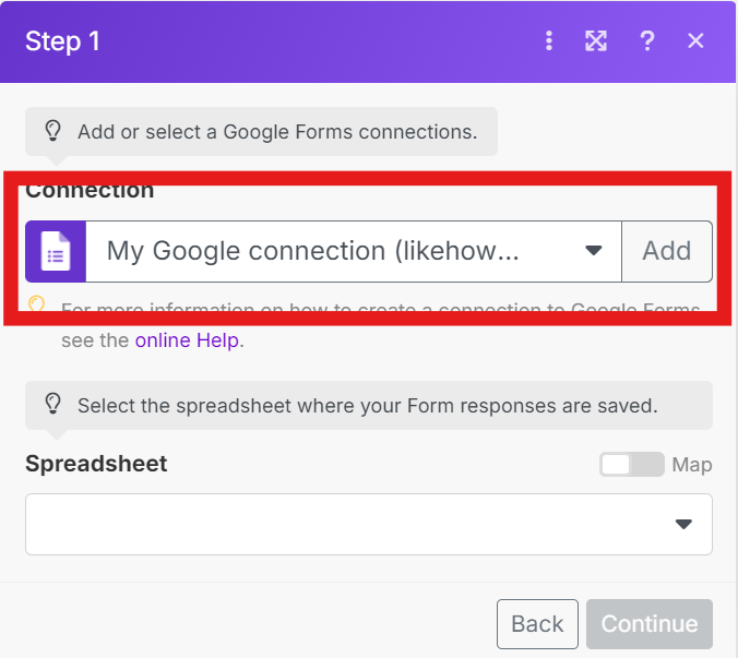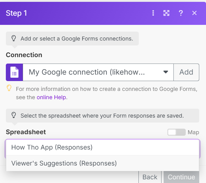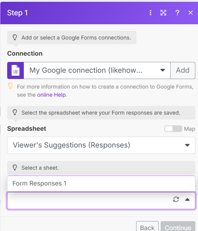 On to “Name”, when you click it you will see a new popup. Choose which value you want from the Google Sheet of your Google Form.